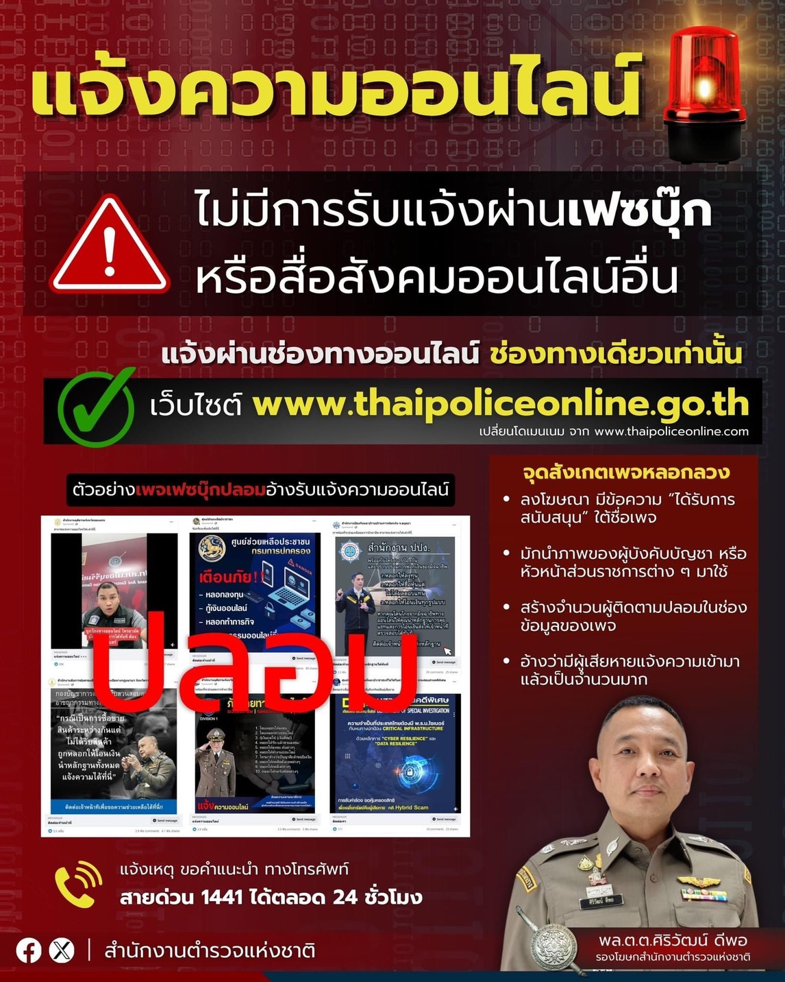 ตร. เตือน แจ้งความออนไลน์มีที่เดียวคือ www.thaipoliceonline.go.th เท่านั้น ไม่มีรับแจ้งผ่านเฟซบุ๊ก เ
